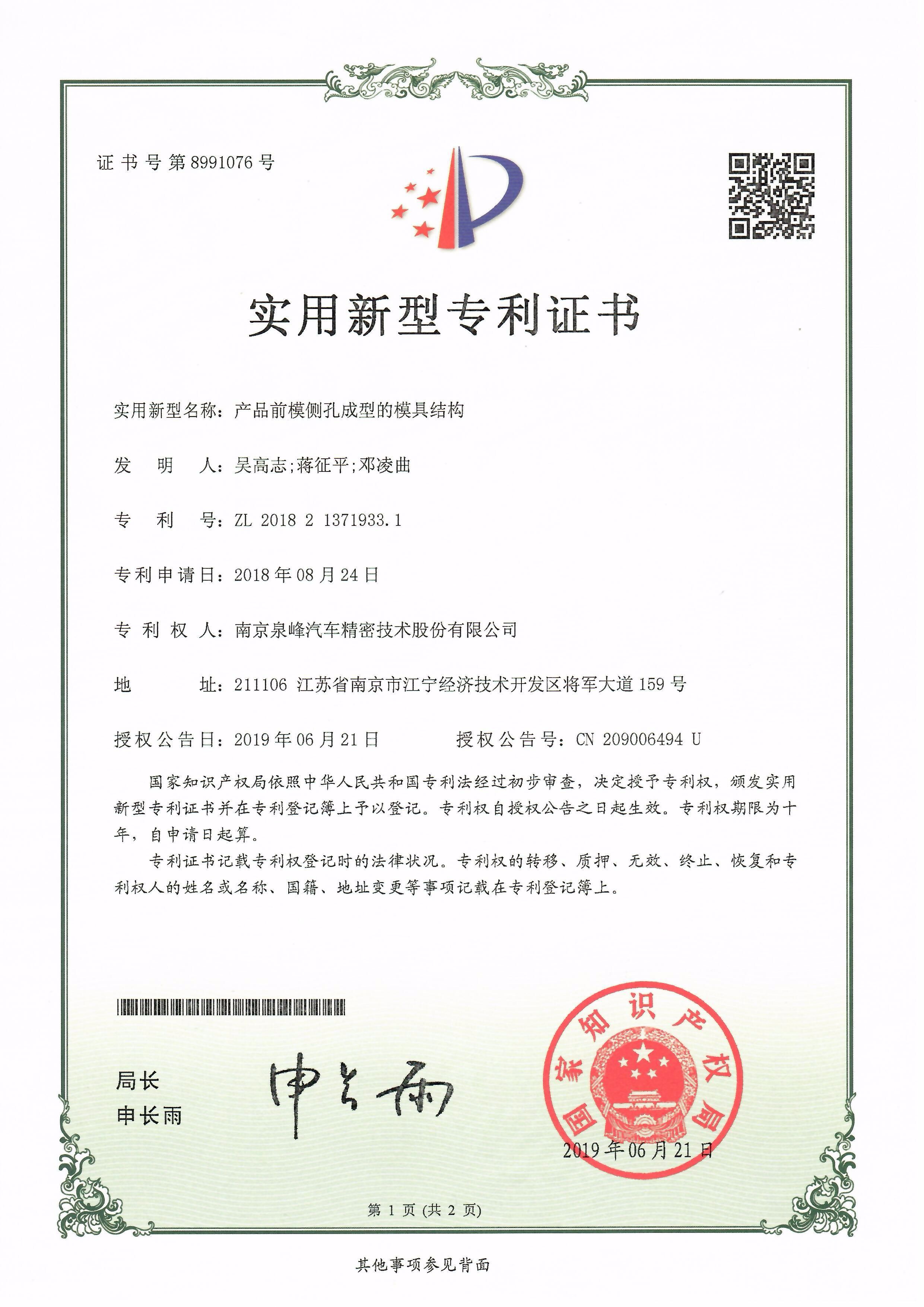 產(chǎn)品前模側(cè)孔成型的模具結(jié)構(gòu)